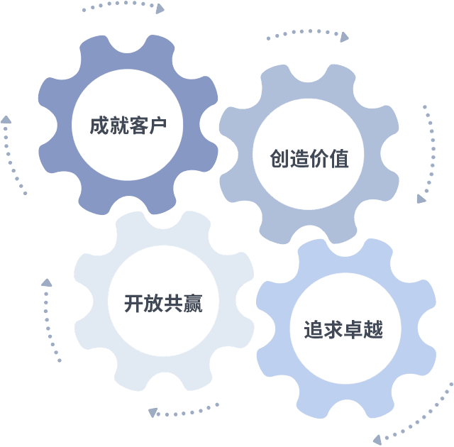 成就客户是一切决策的出发点,,,,创造价值是衡量所有工作的标准,,,,追求卓越是我们做事做人的态度,,开放共赢是我们的格局也是最终的结果。。。价值观的齿轮环环相扣,,,,推动着组织里的每个人不断向前。。。